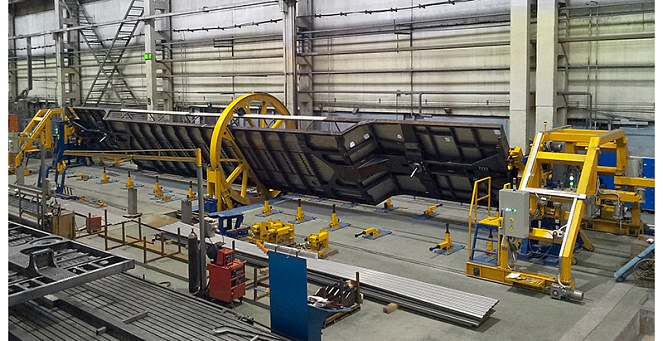 Це універсальний кантувач для приварювання підлоги і універсальний кондуктор-кантувач бічних стін вагонів. Універсальний кантувач призначений для приварювання листів підлоги та монтажу підвагонного обладнання на раму двоповерхових пасажирських вагонів.